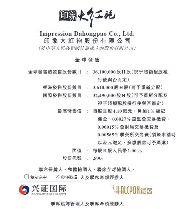 智慧财讯 印象大红袍拟全球发售约3610万股,每股发售价不超4.1港元